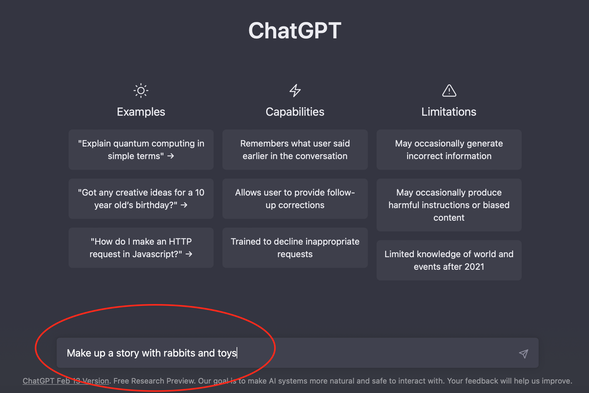우선 구글번역으로 가서 "토끼와 장난감으로 이야기 만들기"라는 내용을 검색하여 나온 "Make a story with rabbits and toys"를 ChatGPT로 검색을 해보겠습니다.